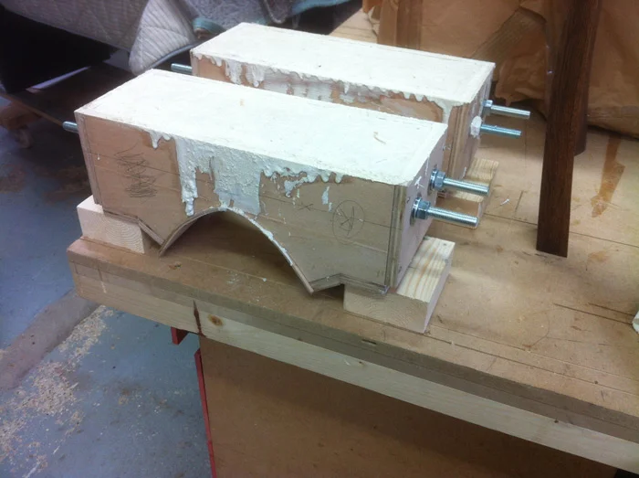 The concrete is taken out of the mould and left to dry further. The steel bolts running through are for strength but also to attach the curved oak leg uprights.