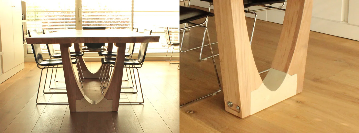 The clients wanted a table that reflected their London apartment’s contemporary exposed concrete and steel structured interior. Firstly, rough sketches were made then further dialogue followed with scale drawings showing different curves and angles to the legs. At the same time several samples of different shades of concrete were cast for the client to choose.