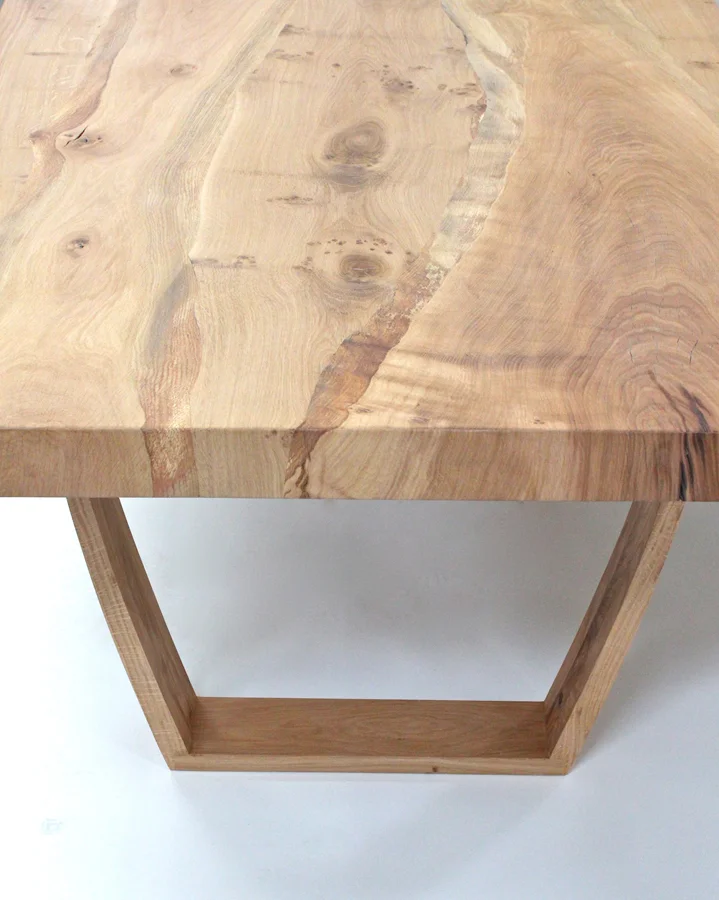 Table in salvaged English oak with wax oil finish. Each table is individual with a choice of oak or various timbers available. The full width of the tree trunk is used with the sap wood being inset into the top as a reminder that it was once a beautiful tree. Each table is made to order in various sizes.